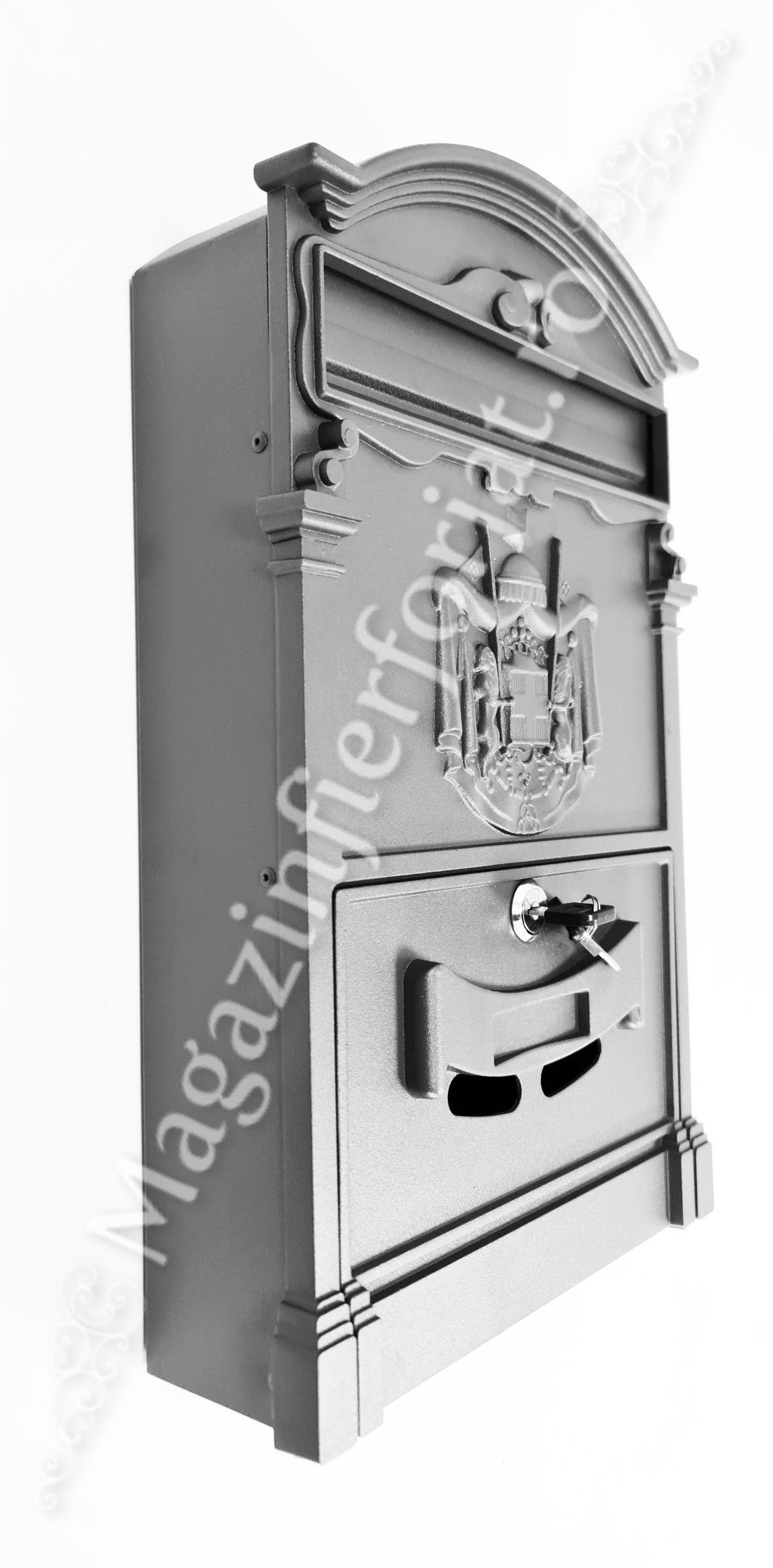 65.202 Cutie postala cu basorelief, culoare GRI-INCHIS H.405mm L.253mm, fabricata din otel si aluminiu