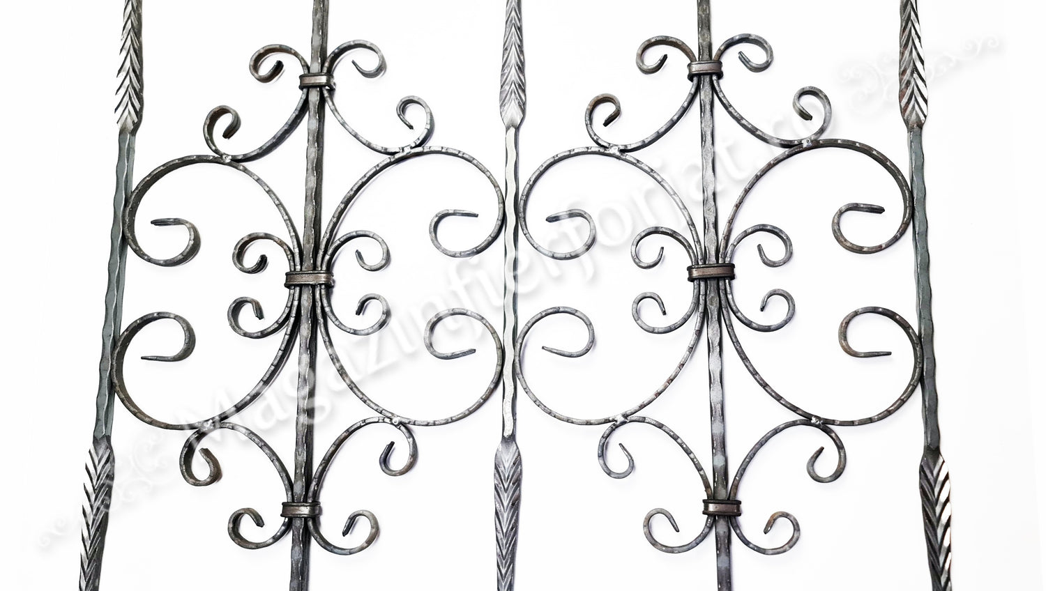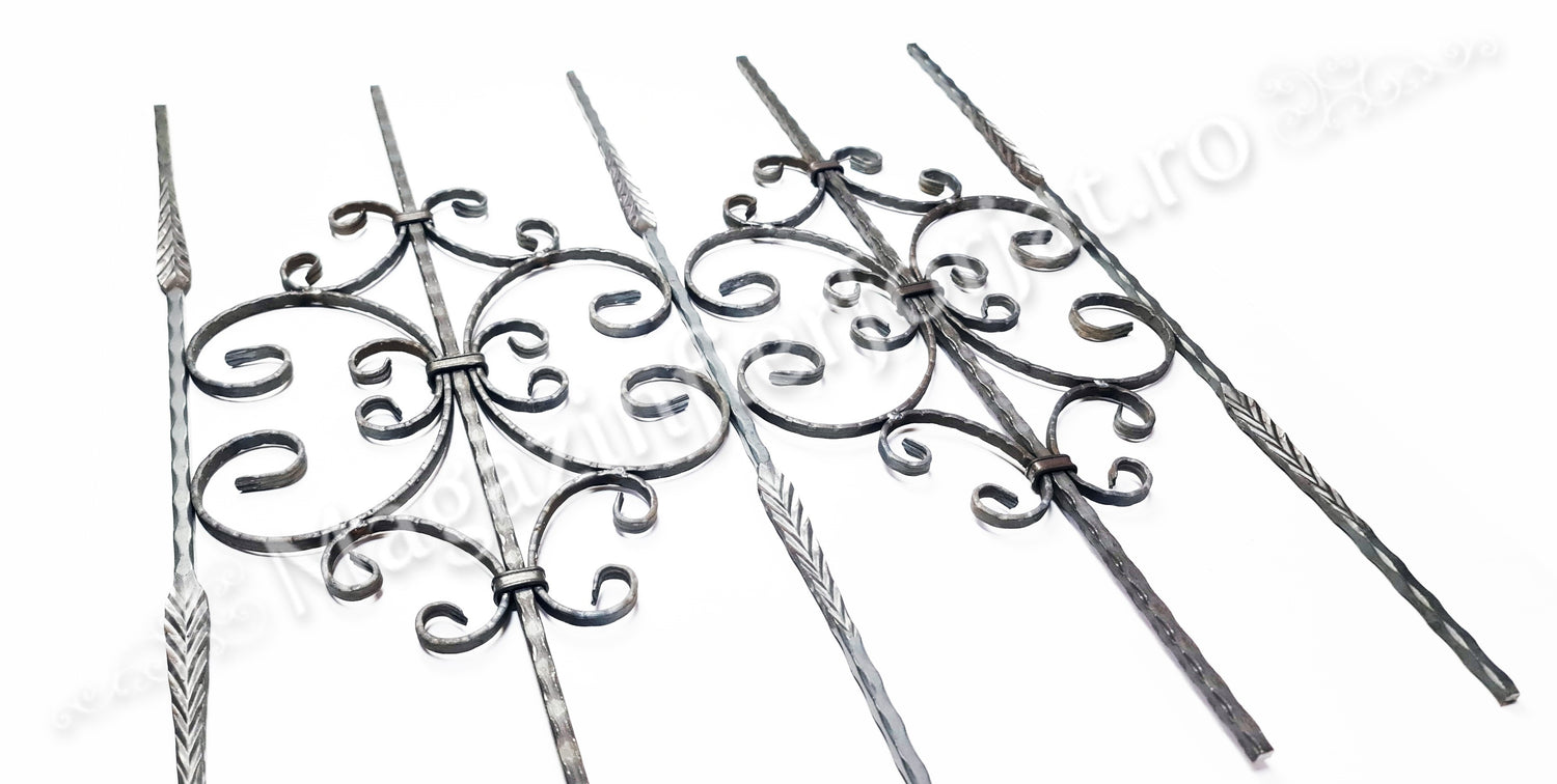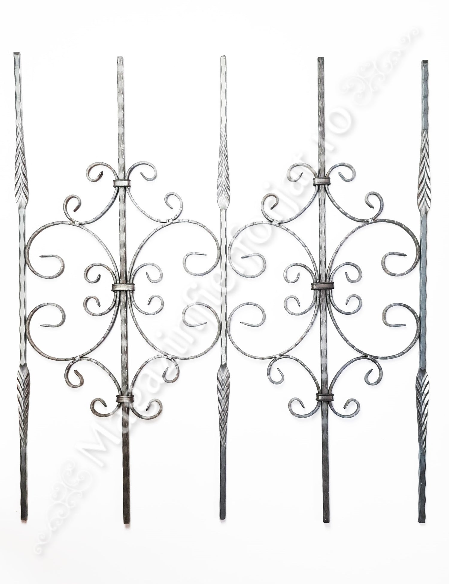 Balustru din fier forjat H.900mm L.375mm cu C-uri de 3 dimensiuni amprentate pe cant, 3 coliere de mascare sudura, cu utilizare universala la balustrade, porti si garduri, produs lucrat deosebit si unic marca UNIVERTIS.