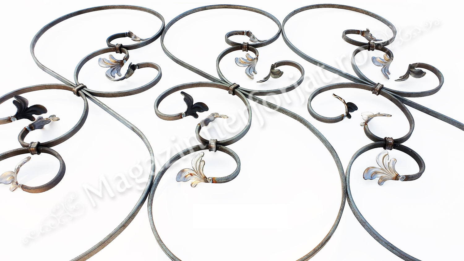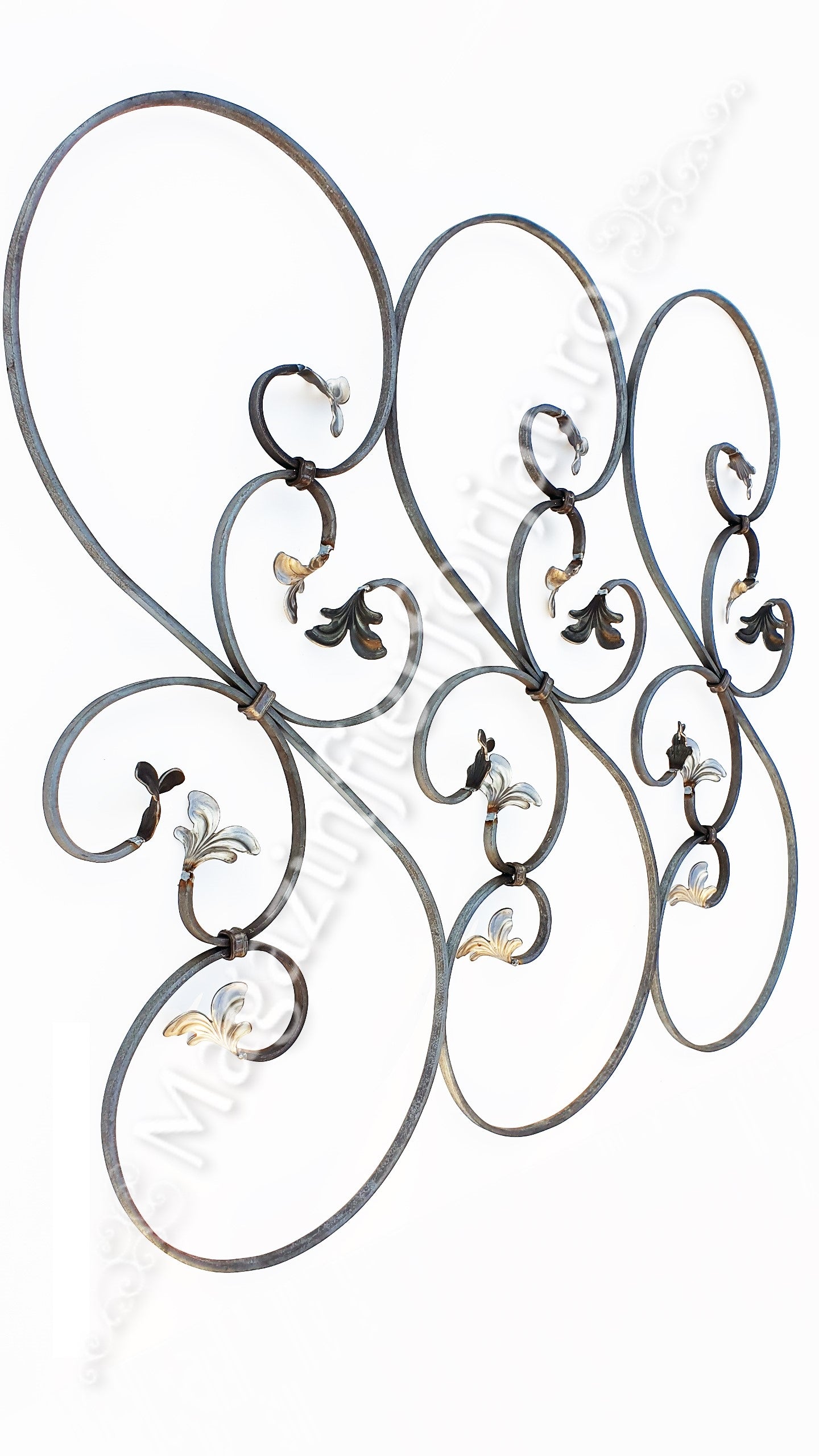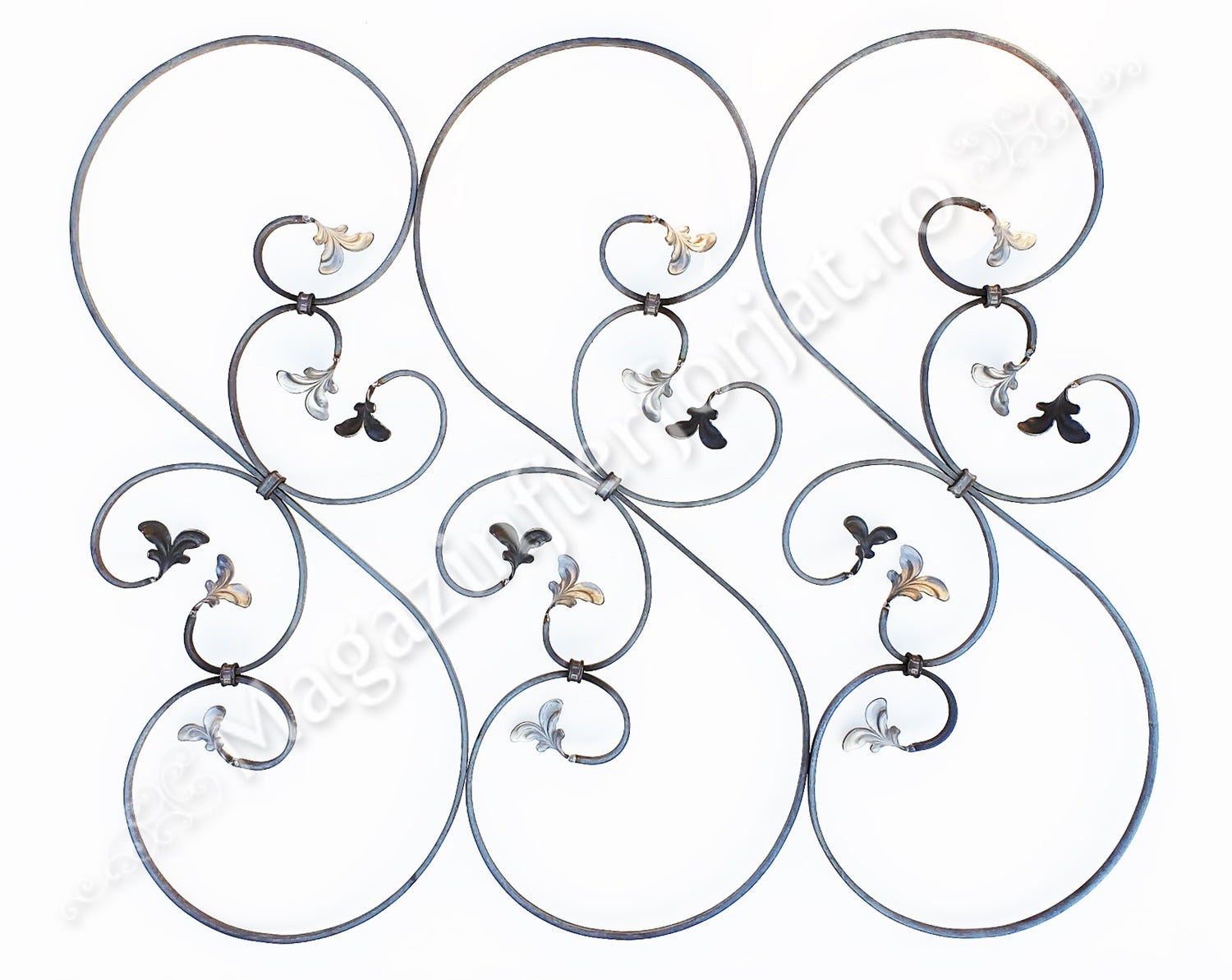 Panou cu frunze forjate in forma de "S" 870x350mm din platband de 12x6mm neted, cu frunze ambutisate cu grosimea de 3mm si coliere de mascare sudura, produs lucrat deosebit si unic marca UNIVERTIS.