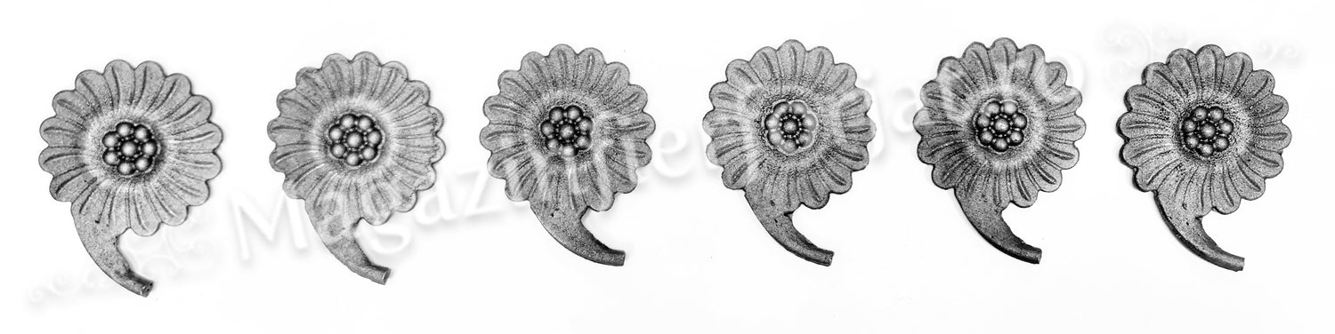 Floare model "CRIZANTEMA" turnata din aliaj oțel-fontă D.90mm x H.110mm, cu basorelief pe ambele fețe, cu o grosime de 4mm pe margine si 9.5mm la centru si o codita de aprox. 10mm grosime.